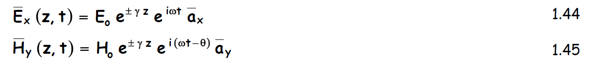 siendo ay y ax vectores unitarios en las direcciones “x” e “y”, y θ el desfase que existen entre los campos E y H. Su valor, función de la frecuencia y de los parámetros eléctricos del medio de propagación, se deduce sustituyendo cualquiera de las ecuaciones 1.37 y 1.38 en las primeras del sistema dado por las ecuaciones de Maxwell particularizadas para q = 0 ( 1.8 y 1.9 ) obteniéndose: